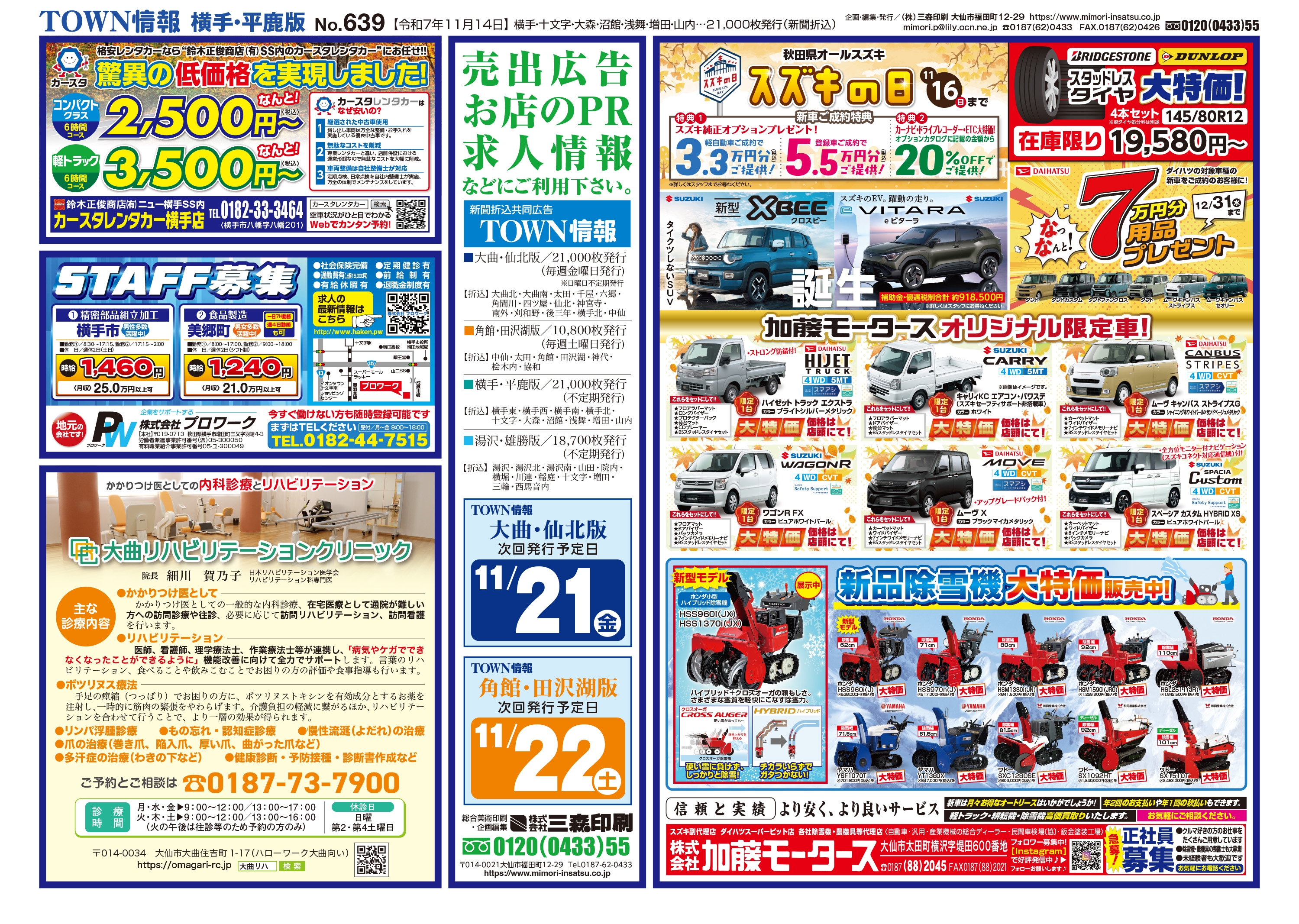 大曲・仙北、横手・平鹿、湯沢・雄勝に配布されるTOWN情報幅広い地域をカバーする情報を掲載中