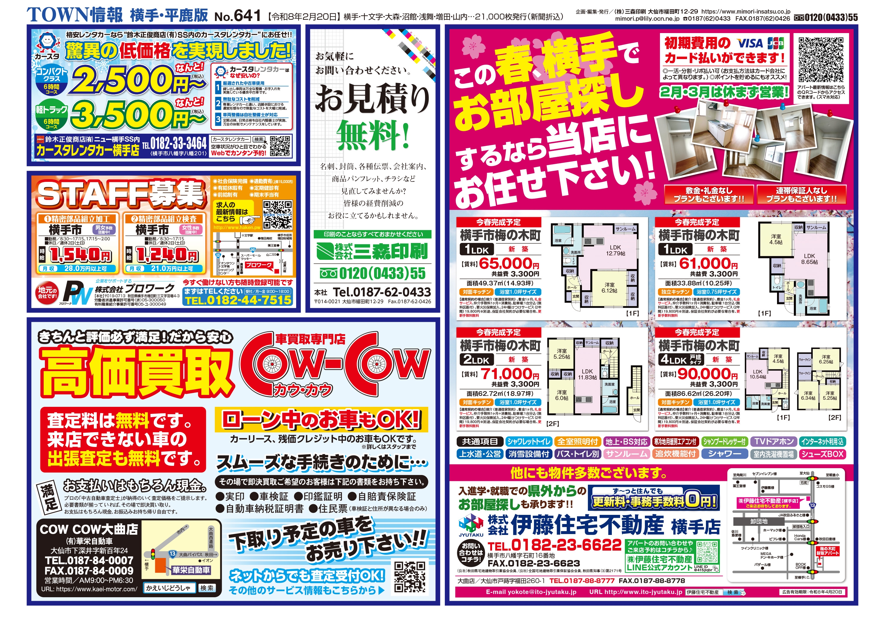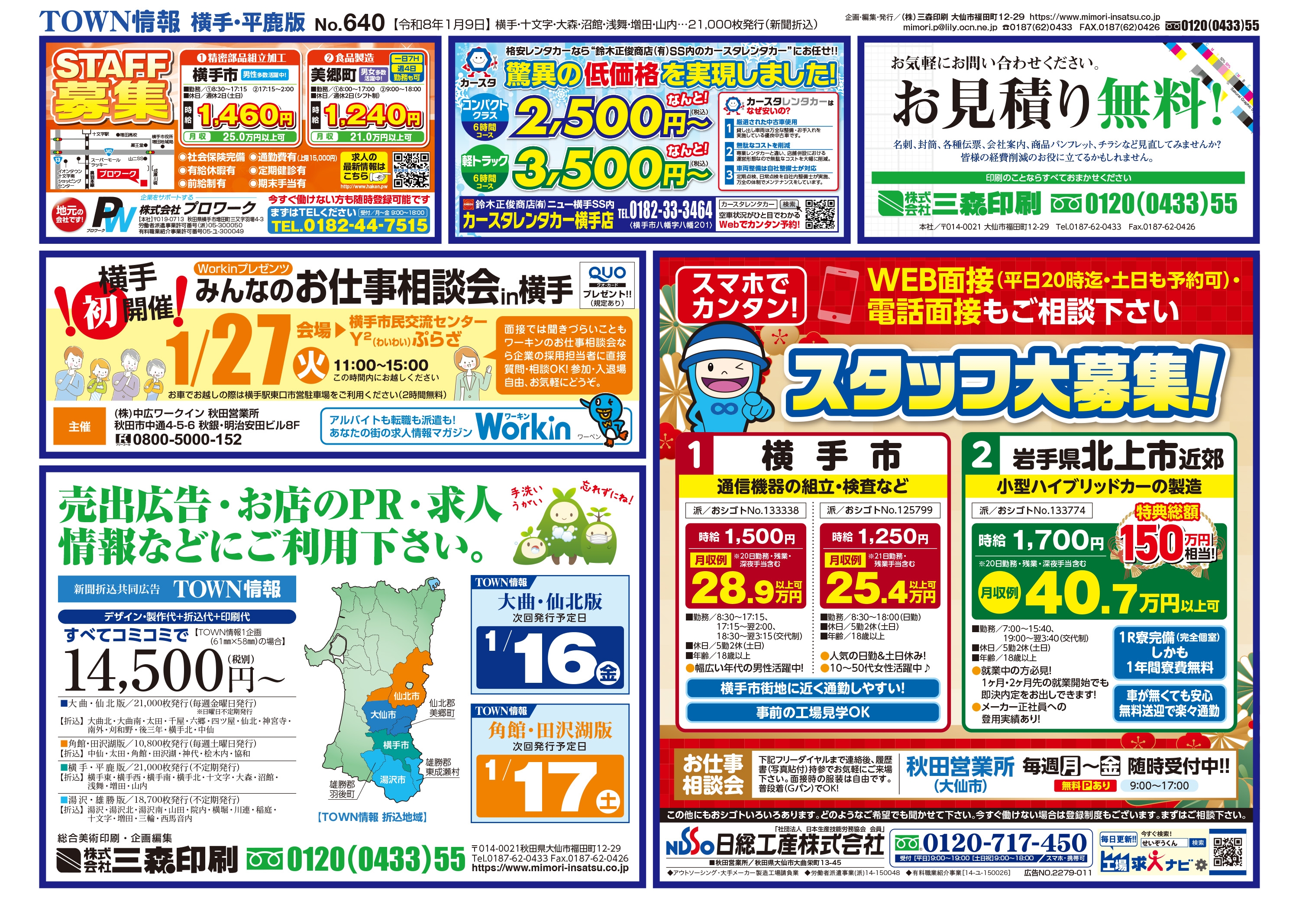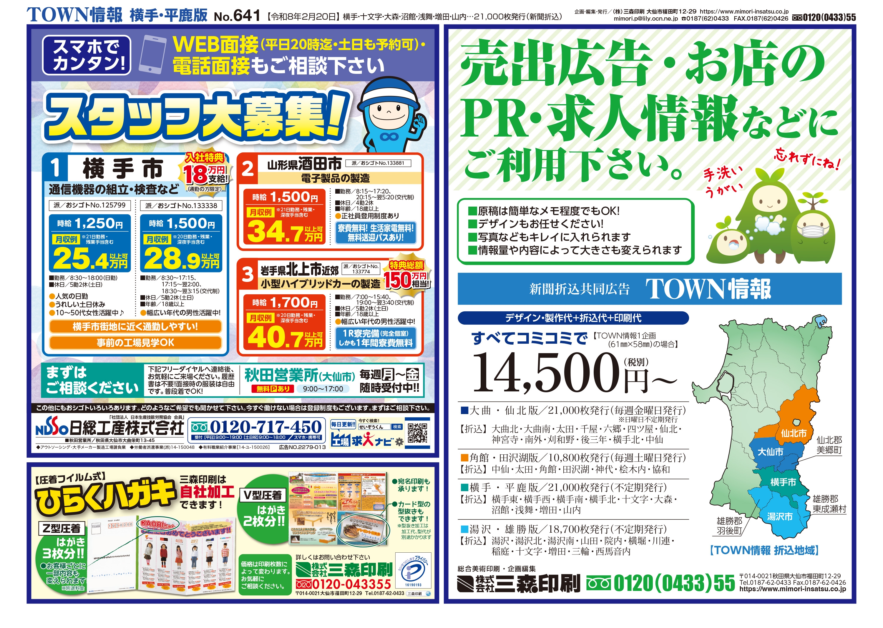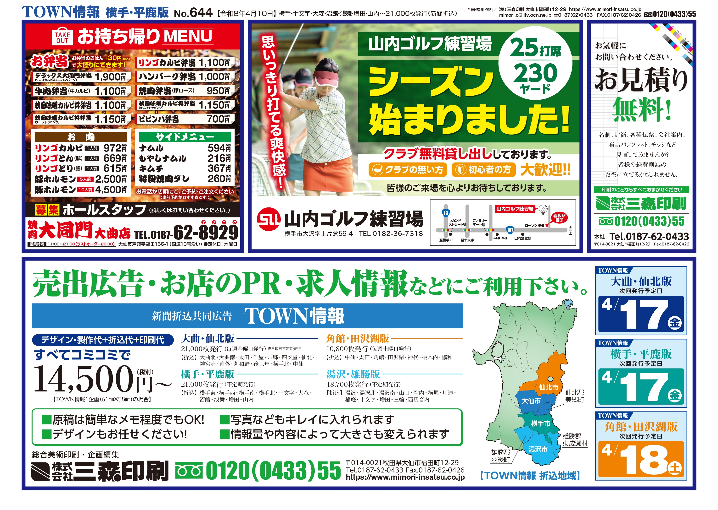 大曲・仙北、横手・平鹿、湯沢・雄勝に配布されるTOWN情報幅広い地域をカバーする情報を掲載中